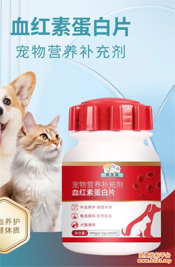 你的宠物是否有精神不振、毛色暗淡的情况?这可能是贫血在作祟。我们的宠物血红蛋白片,是专为宠物健康精心研制的营养补充剂。富含优质的血红蛋白成分,以及铁、维生素 B12、叶酸等多种关键营养素,能够有效促进宠物红细胞的生成,提高血红蛋白水平,为宠物补充所需的氧气和营养,让它们焕发出健康活力。无论是因营养不良、疾病导致的贫血,还是术后、产后需要恢复的宠物,这款血红蛋白片都能为它们提供精准的营养支持,帮助宠物快速恢复体力,增强免疫力,让宠物的身体更健康,陪伴更长久。