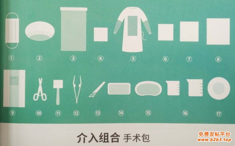 手术包配置:一次性使用医用口罩1个、一次性使用帽1个、器械盘套1条、擦手巾(40*40cm)2块、一次性使用手术衣(加强型)2件、一次性使用垫单3条、一次性使用吸水巾(60*75cm)1条、一次性使用中单1条、一次性使用手术洞巾(心血管单)1条、塑料止血钳1把、海面刷(弯)3把、塑料镊子1把、一次性手术刀1把、长方形塑料盘1个、弯盘2个、量杯(120ml、150ml)各1个、平底圆盘1个。