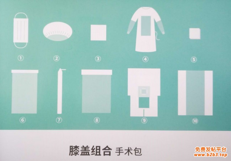 手术包配置:一次性使用医用口罩1个、一次性使用帽1个、器械盘套1条、擦手巾(40*40cm)4块、一次性使用手术衣(加强型)2件、纱布块10片、带纸板防护罩1个、一次性使用医用单(臀底单)1条、一次性使用手术洞巾(膝盖手术单)1条、一次性使用包布1条。