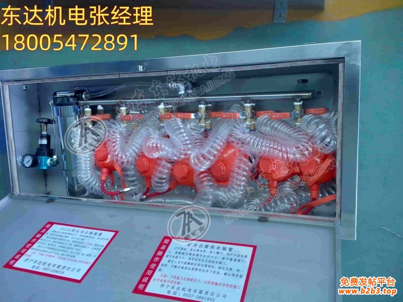 此装置在压风自救装置的基础上增加了进水管、净水过滤器、水型压力表、排水装置(多组)等。箱体、安装板、总进气管、总进水管采用不锈钢制造而成。一箱六组供水,六组供气(可根据要求设计组别)。